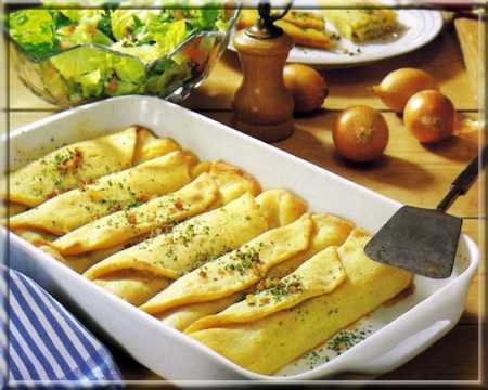 4.Dans un robot mixeur, les mixer avec le jambon puis mélanger avec crème, sel et poivre. Garnir les crêpes de cette préparation et les disposer sur un plat à four huilé.
