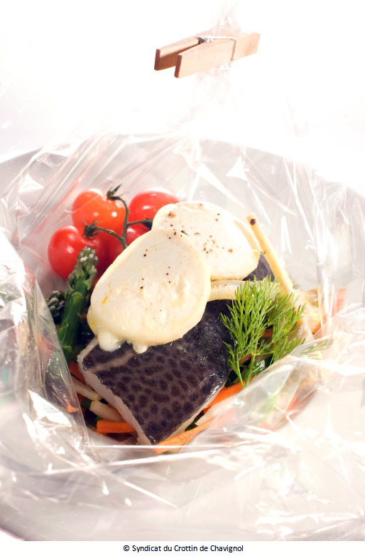 3• Disposer les légumes crus au centre du papier, superposer le pavé de poisson puis les lamelles de Chavignol.