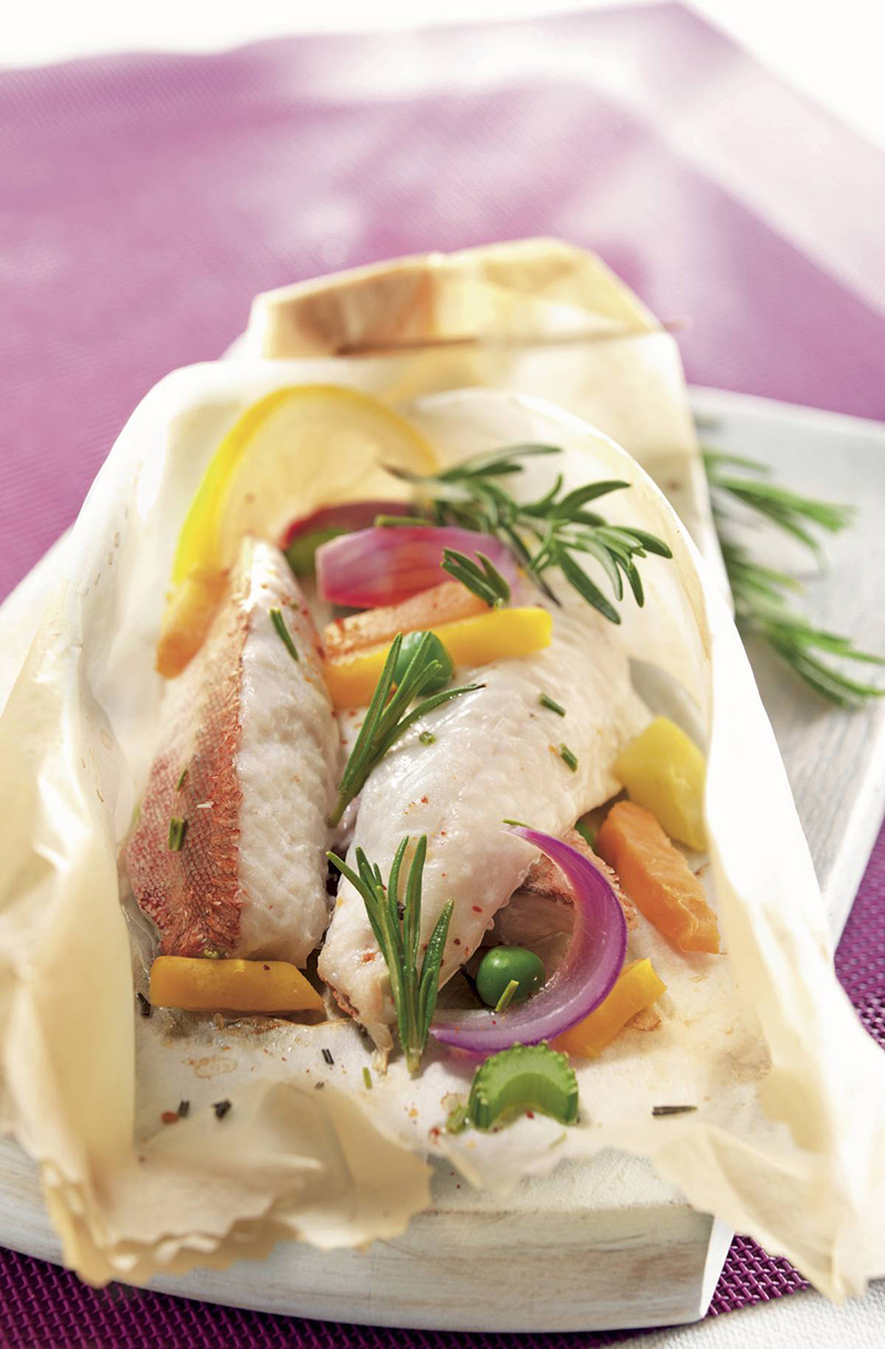 ③• Déposer au centre d’un papier de cuisson, un ou 2 filets de rougets. Entourer les de petits légumes, d’ail émincé, d’aiguilles de romarin, saupoudrer de fleur de sel, d’une pincée de piment, et arroser d’un filet d’huile.