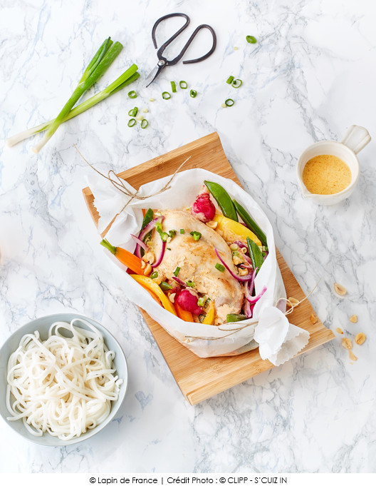 Suggestion : Dans une sauteuse, faire colorer les cuisses de lapin à l’huile d’arachide sur les 2 faces avant de les mettre dans la papillote. Réduire alors le temps de cuisson au four à 40 min.