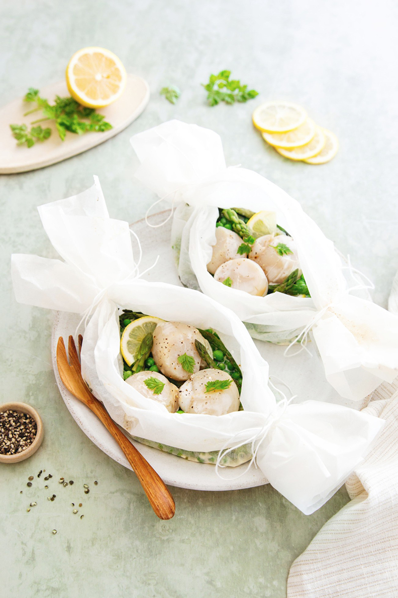 Papillote de noix de Saint-Jacques aux asperges et petits pois