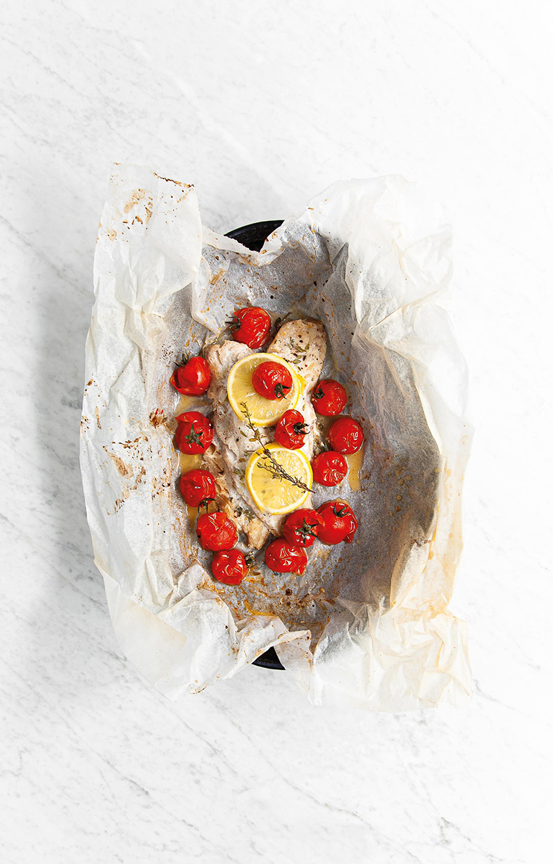 ③• Préparer une papillote de papier sulfurisé dans laquelle vous disposez les filets de tacaud l’un sur l’autre. Les arroser d’un filet d’huile d’olive et disposer autour les tomates cerise.