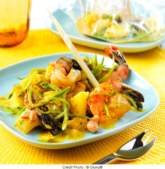 7• Sur une feuille d’aluminium, disposez un peu d’ananas, de noix de cajou, d’échalote, de pois gourmands, de citronnelle, de gingembre et 4 gambas.