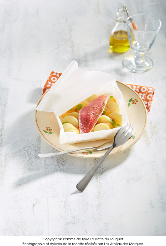 Papillotes de Ratte du Touquet, tomates jaunes et rouget