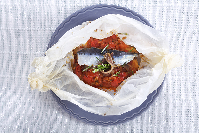 ⑦• Répartir la compotée de tomates/anchois et placer les filets de sardines au milieu, ajouter un anchois.