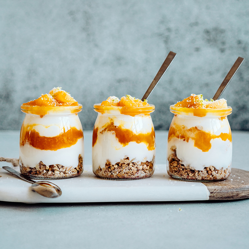 ③• Dans des verrines, des pots de yaourt ou bien des bols, déposez une première couche de granola. Puis ajoutez une couche de yaourt, une couche de compotée de fruits exotiques, à nouveau une couche de yaourt, et terminez par de la compotée.