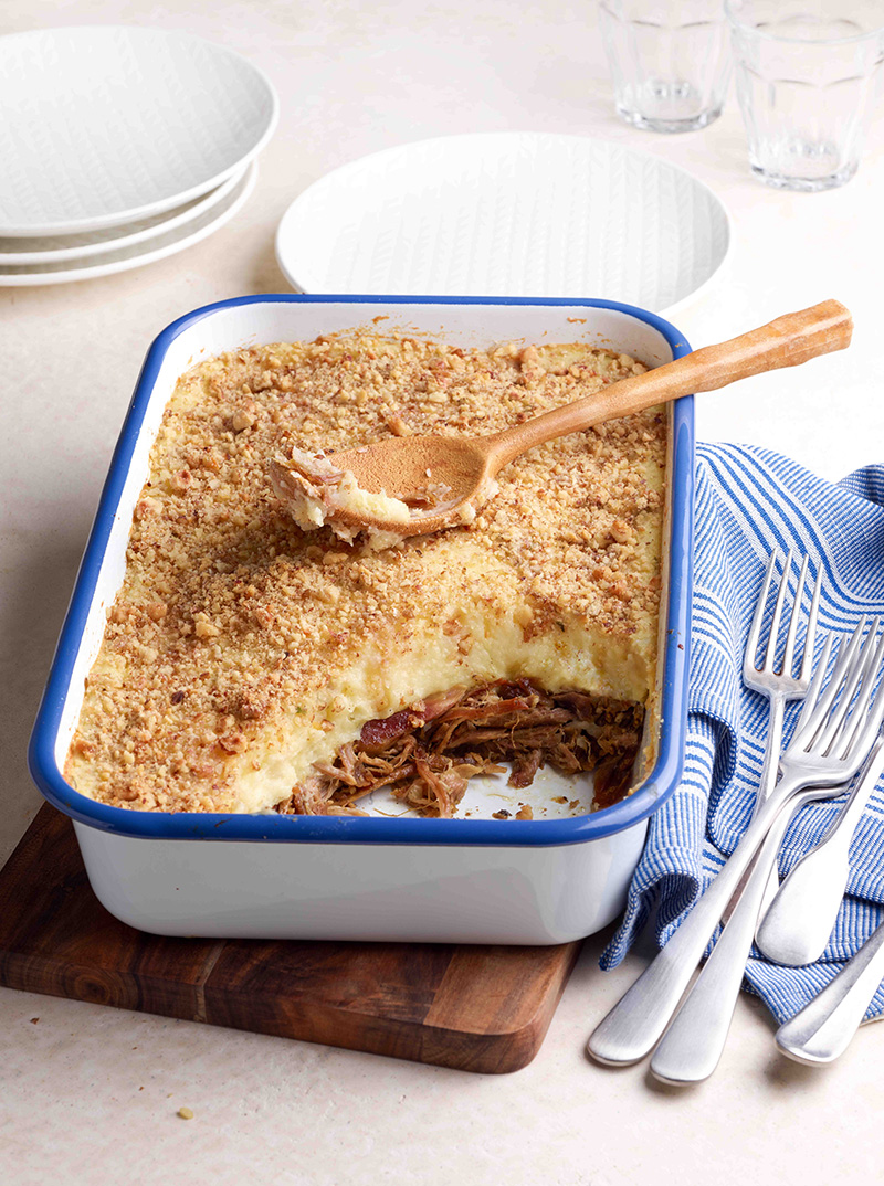⑤• Huiler très légèrement un plat à gratin. Y déposer la viande effilochée, puis couvrir de purée.