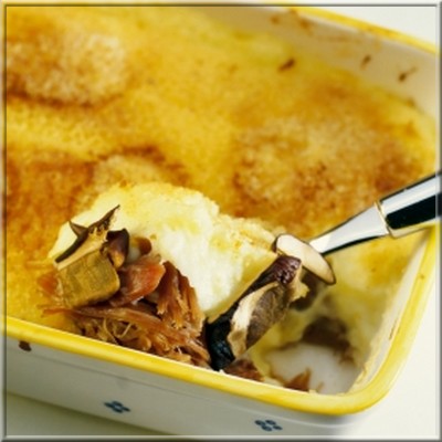 Déposer une couche de purée au fond d'un plat à four, y répartir quelques cèpes et la viande de canard effilochée. Réitérer l'opération en terminant par une couche de purée. Parsemer de chapelure. Enfourner et cuire 15 à 20 minutes.