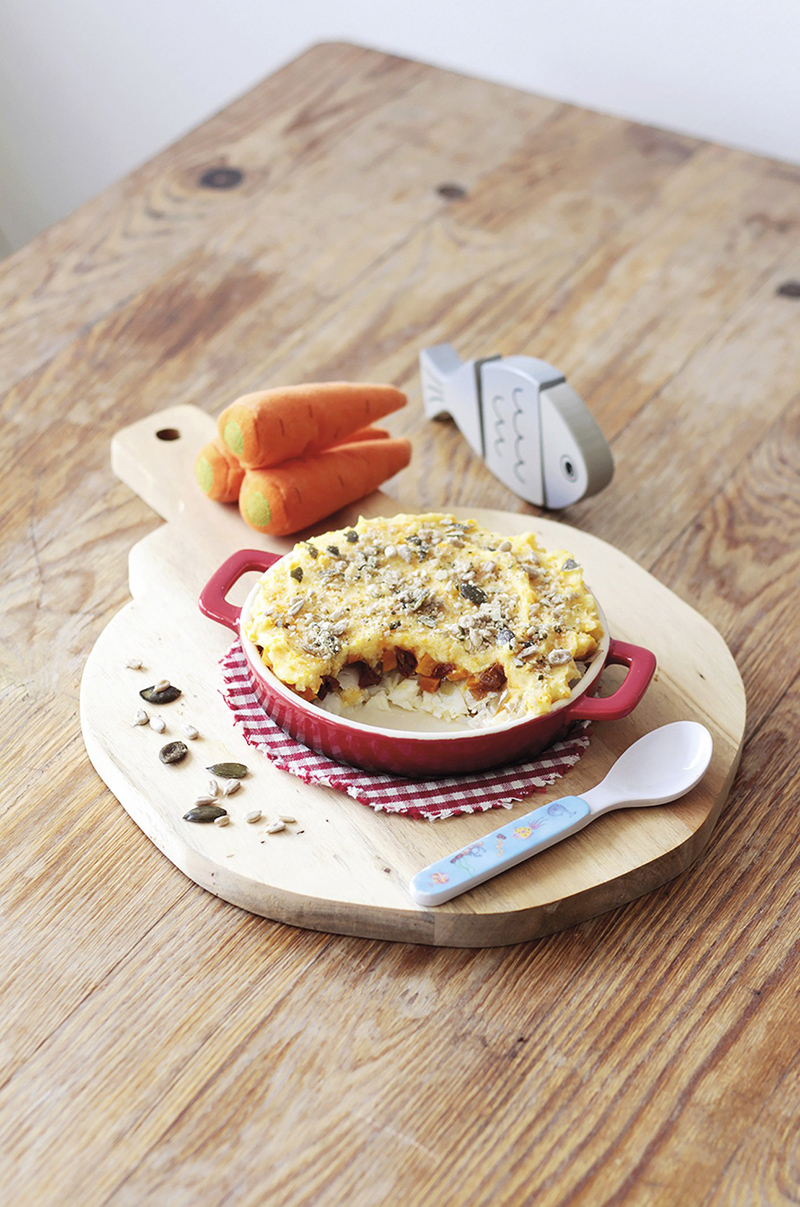 ⑤• Au fond d’un plat, répartir le poisson puis le recouvrir avec la purée et les graines.