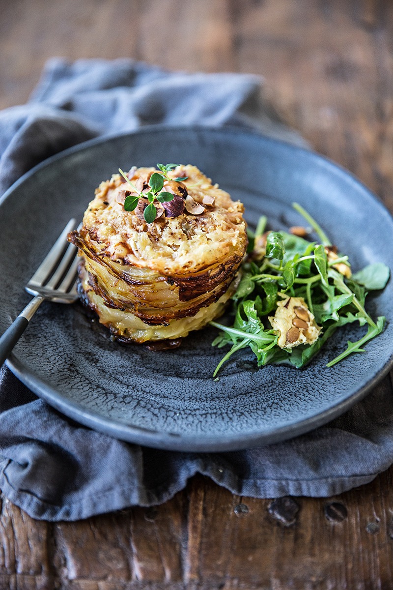 ③• Sur une plaque de four recouverte de papier sulfurisé, disposer des cercles en inox et les beurrer. Superposer les rondelles de pommes de terre dans le cercle en veillant à bien badigeonner de beurre fondu et assaisonner chaque couche. À mi-hauteur, disposer quelques rondelles de poire et finir avec le reste de pommes de terre.