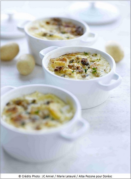 Terminer avec une couche de Grenailles en plaçant les tranches joliment. Arroser avec le reste des œufs battus, badigeonner d’huile d’olive, saler légèrement. Enfourner pendant 25 minutes : les gratins doivent être bien dorés.