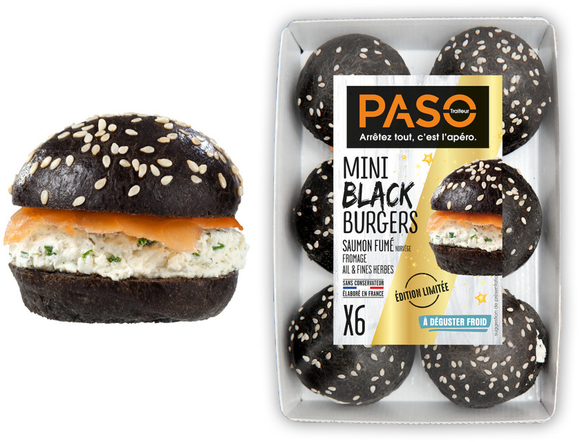 Les Mini Black Burgers débarquent en édition limitée avec six petits pains made in Paso Traiteur colorés à l’encre de seiche garnis de saumon fumé et de fromage ail et fines herbes. Ils sont à déguster froid, sans préparation supplémentaire.