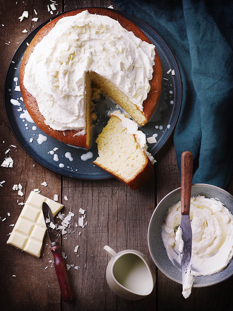 ⑥• Quand le gâteau a absorbé tout le sirop, faire fondre le chocolat blanc et mélanger avec le yaourt.