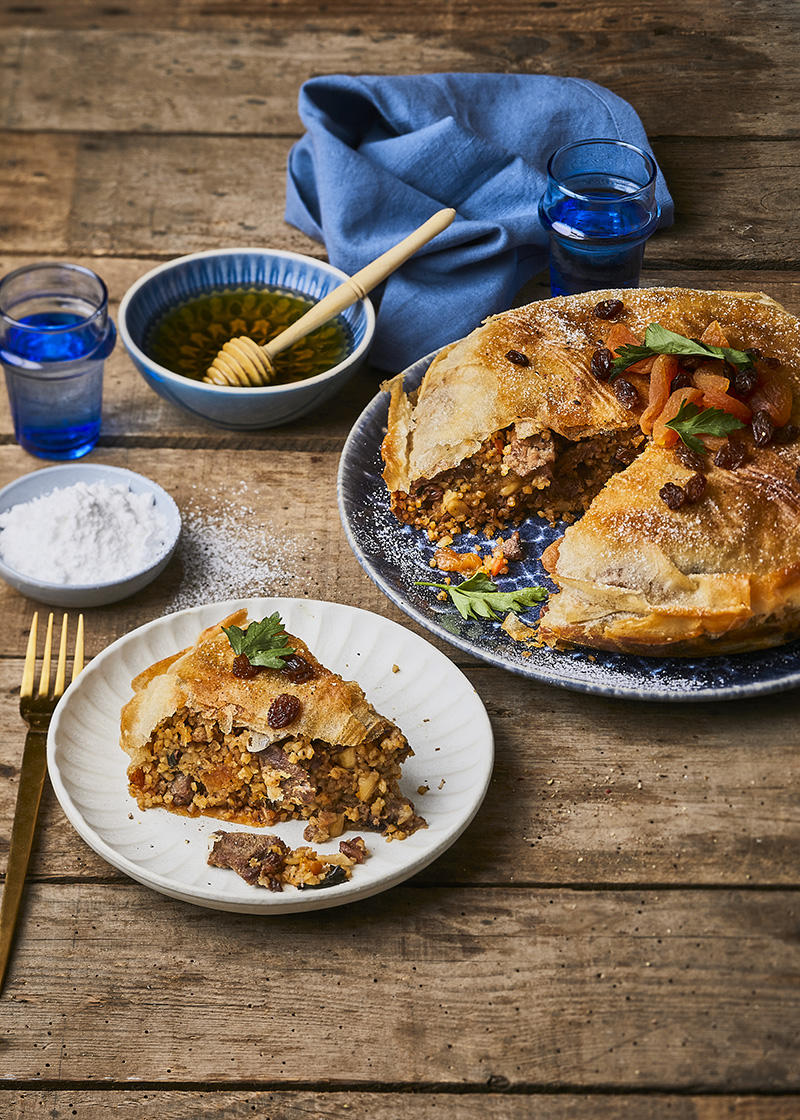 Pastilla d’agneau au boulgour, raisins secs et miel, abricots secs et amandes
