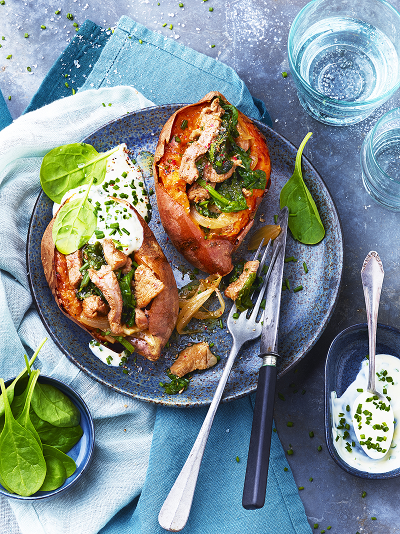 ④• À la sortie du four, fendre les patates douces en deux et répartir la préparation à l’agneau en leur cœur.