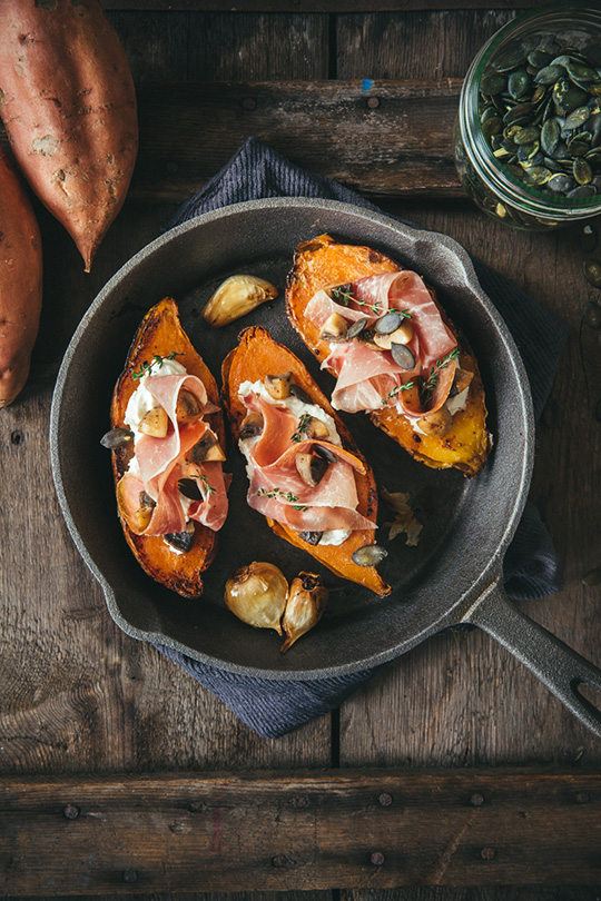Patates douces rôties au jambon cru Aoste et champignons