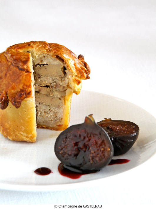 Pâté en croûte aux sots-l’y-laissent et foie gras, figues confites en marinade de champagne