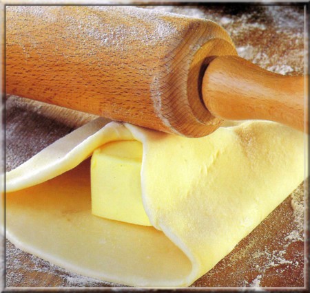 5.Posez le beurre au centre de la croix et rabattez les branches de la croix les unes sur les autres pour l'emballer étroitement. On obtient une sorte de rectangle épais que l'on farine avant de le retourner, et que l'on pose devant soi, partie la plus étroite
