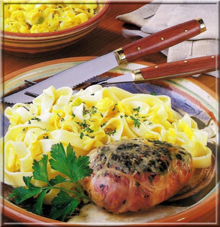 Servir sur un plat chaud avec les crépinettes posées sur un lit de pâtes.