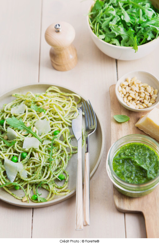 ④• Faîtes cuire les pâtes selon les indications de l’emballage. Égouttez. Ajoutez le pesto, et mélangez. Servez dans des assiettes creuses. Ajoutez les pignons de pin, les copeaux de parmesan.