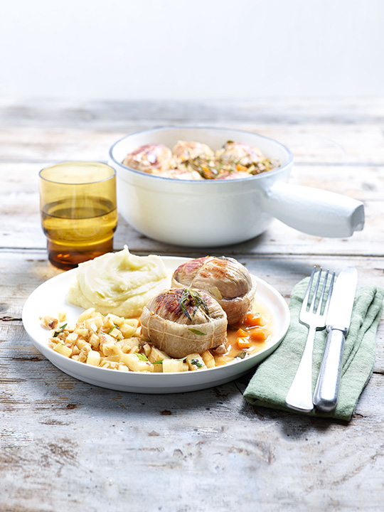 Paupiettes de veau braisées, purée de panais et estragon, cerneaux de noix