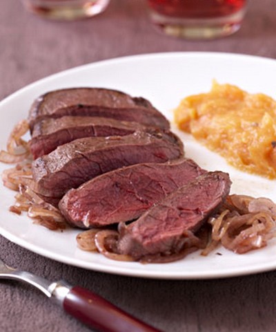 4.Servez les pavés en tranches, avec les échalotes et une purée de patates douces.