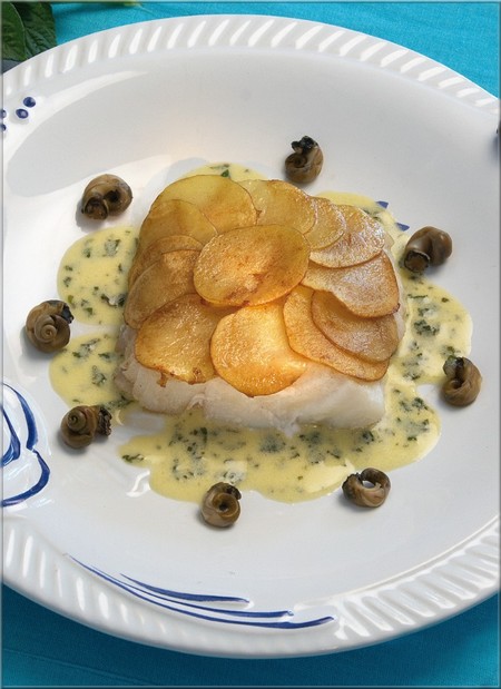 Dresser les pavés de cabillaud au centre de l’assiette, parsemer de bigorneaux et de la vinaigrette d’herbes.