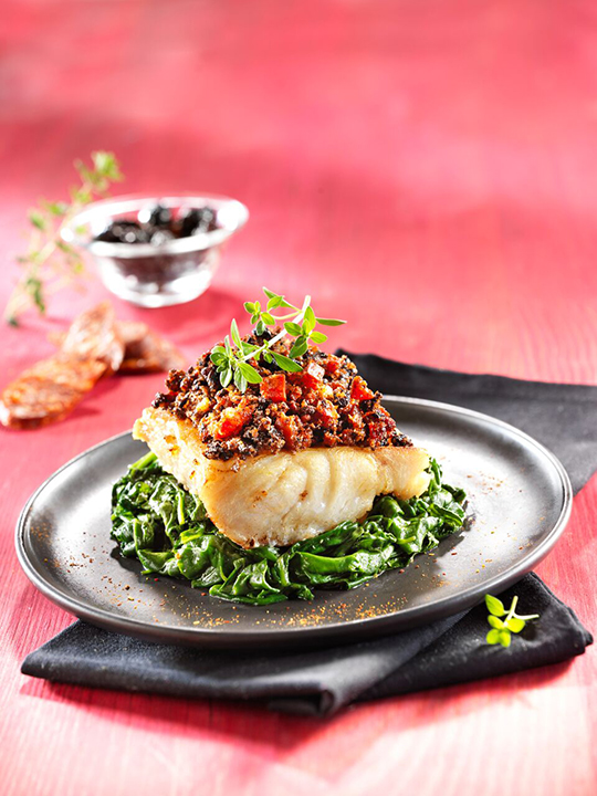 Pavé de Julienne en crumble de chorizo, sur lit d’épinards