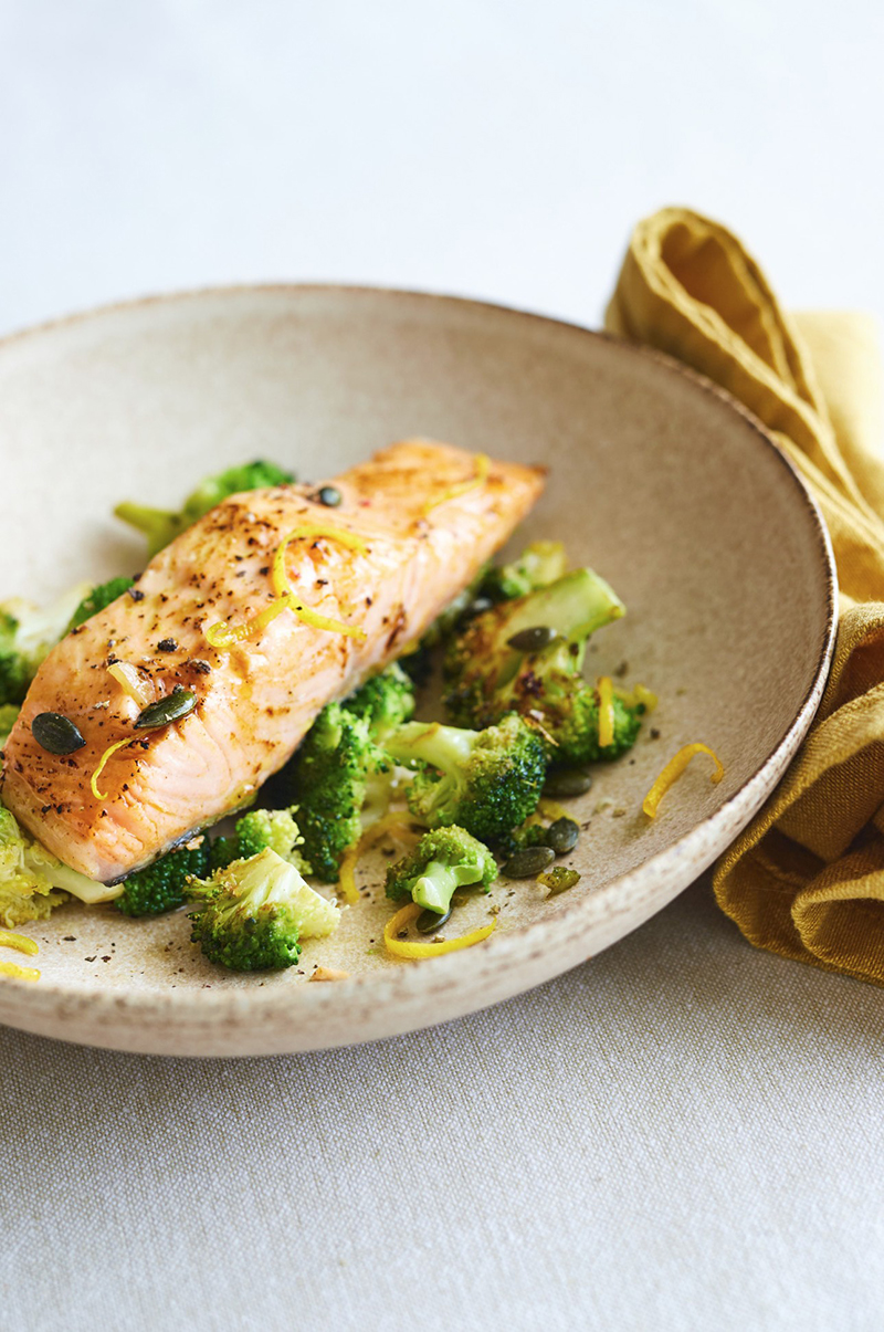 Pavé de saumon, brocolis snackés, zeste de citron et graines de courges grillées