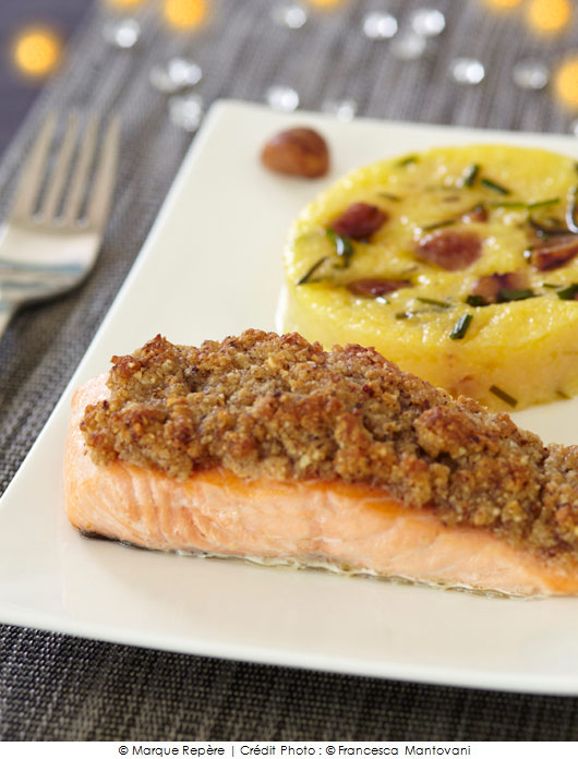 Pavé de saumon en croûte de noisettes, polenta aux châtaignes et aux herbes