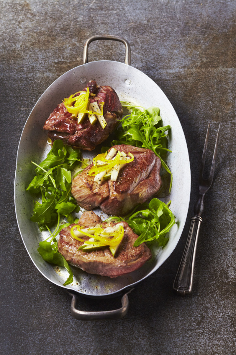 Servir les pavés d’agneau bio recouverts de zestes de citrons confits, de leur sirop de cuisson et de bâtonnets de poire, le tout nappé avec l’huile d’olive de cuisson.