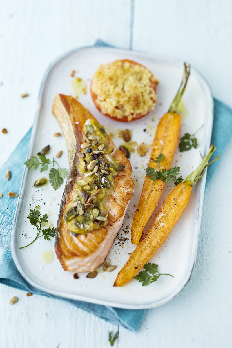 Pavés de saumon grillé à la moutarde au miel, graines torréfiées, carottes rôties et tomate crumble