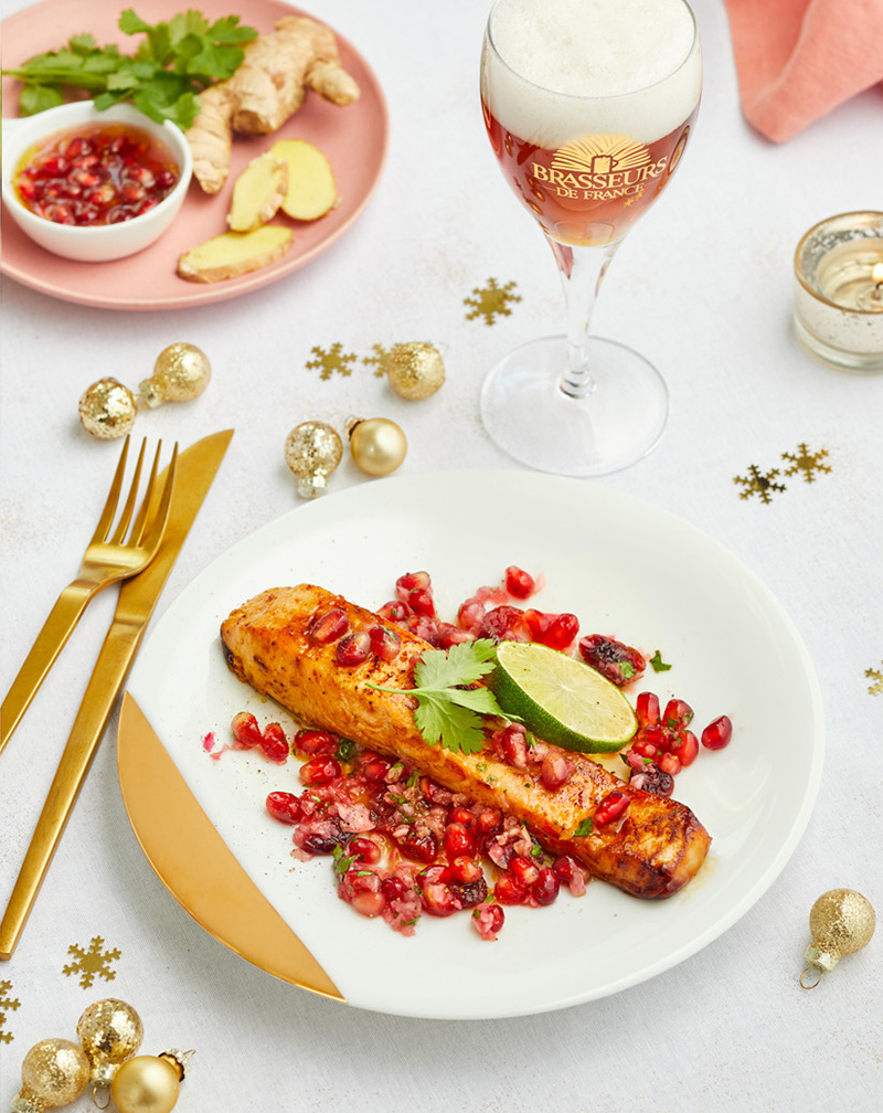 Pavés de saumon laqués au miel à la bière de Noël, sauce salsa revisitée à la grenade et aux cranberries