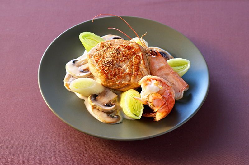 Les napper de champignons à la crème et décorer avec les langoustines.