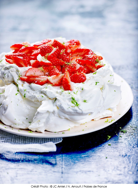 Recette classique dont les enfants raffolent et très rapide à réaliser en ces journées trop bousculées par le stress, la pavlova est un dessert léger comme un nuage, gourmand et frais. Il est composé d’une meringue, de fraises de France et éventuellement un peu de chantilly. La meringue doit être croustillante à l’extérieur et moelleuse à l’intérieur. Nommée en l’honneur de la ballerine russe Anna Pavlova, la pavlova fait partie de ses desserts qui fait toujours son petit effet à table grâce à un dressage très élégant. Pour cette recette utilisez des fraises Gariguettes bien juteuses et fondantes. Leur arôme acidulé se marie parfaitement avec la meringue.