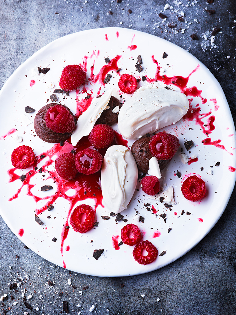 – Disposer par dessus des quenelles de meringues, des boules de crémeux chocolat et des framboises garnies de coulis gélifié.