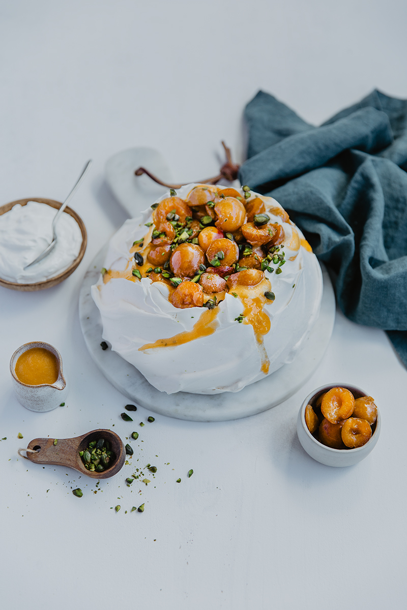 ⑧• Verser la chantilly dans le creux du dôme de meringue, ajouter le coulis de mirabelles.