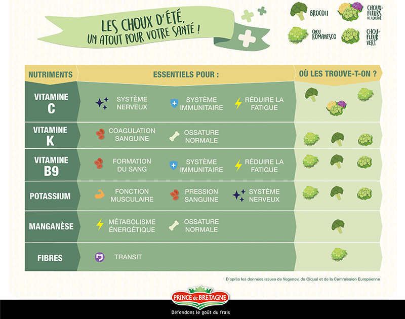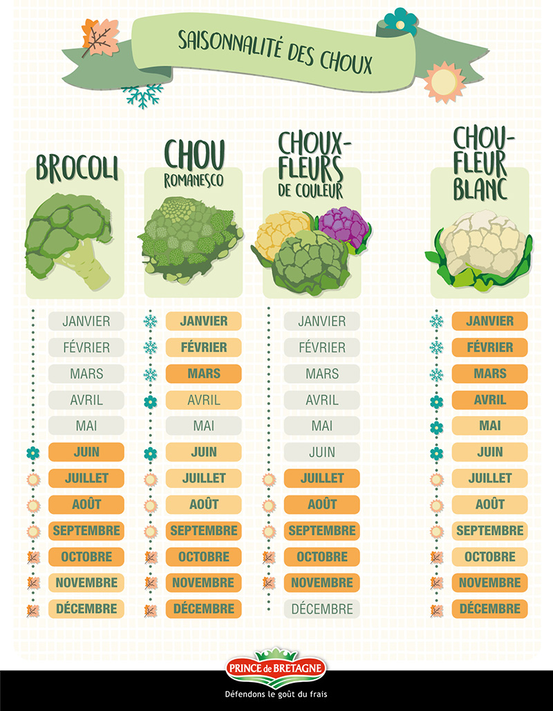 Les choux semblent répondre à une logique imparable : en juin, le vert foncé du brocoli prend le relais de l'emblématique chou-fleur blanc breton, accompagné dès juillet par les choux-fleurs colorés (orange, vert et violet). Le chou romanesco sera au top de sa saison pour la rentrée de septembre et présent jusqu’en décembre avant de laisser à nouveau la place au chou-fleur d’hiver.