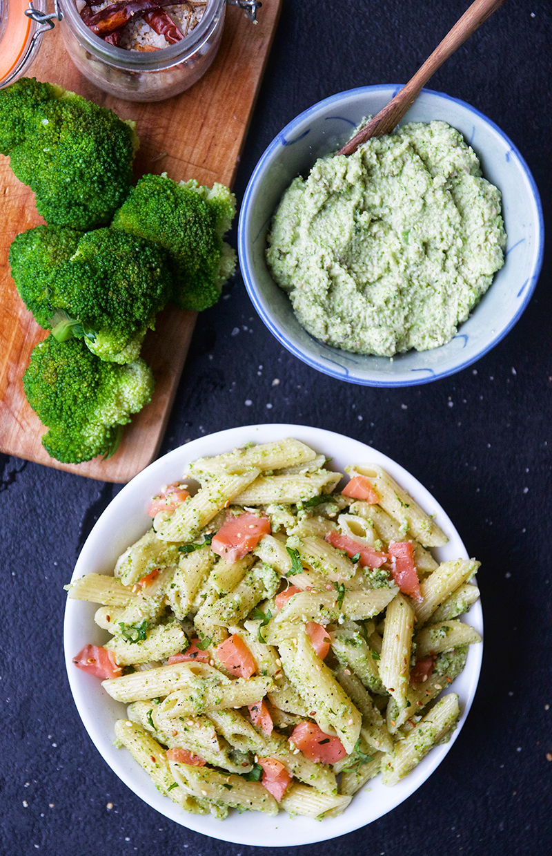 ①• Conservez deux fleurettes de brocoli cru. ( ça sera pour la fin de la recette ). Lavez les fleurettes de brocoli et disposez-les dans une casserole. Couvrez d'eau et salez. Faites cuire pendant 3 à 4 afin que les brocolis soient encore tendres. Égouttez-les. Placez les brocolis dans le bol de votre blender. Épluchez la gousse d'ail et ajoutez-la dans le bol. Ajoutez les graines de tournesols, les herbes ainsi que le parmesan. Mixez. Ajoutez l'huile d'olive, un peu de sel et de poivre et mixez à nouveau jusqu'à obtention d'une préparation homogène. Réservez.