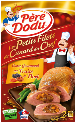 Pour les amateurs de sucré-salé, le Chef Père Dodu a sélectionné de tendres et savoureux Filets de Canard avec un cœur gourmand et parfumé 100% aux fruits de Noël. Les petits Filets de Canard du Chef, une idée repas déjà portionnée, aux saveurs raffinées pour un service à l’assiette de qualité. De quoi créer la surprise et régaler les palais les plus fins !