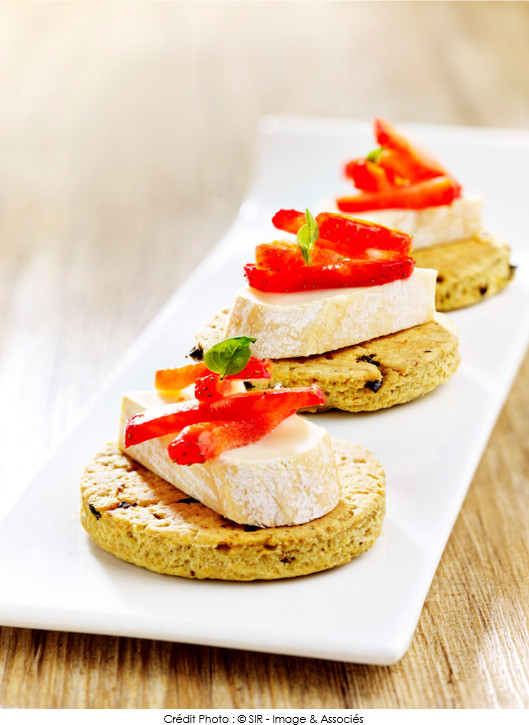 Sur les sablés déposer une tranche de Reblochon et des bâtonnets de fraises.