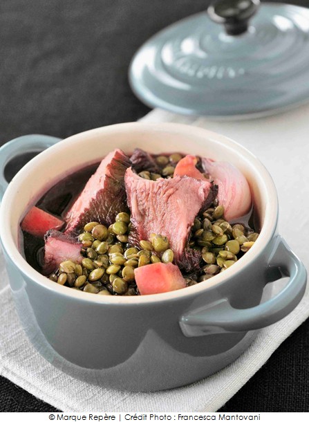 8• Quand les lentilles sont prêtes, ajouter la viande coupée en morceaux, les fruits rouges préalablement décongelés, et compléter le jus de cuisson de la cocotte avec celui de la viande.