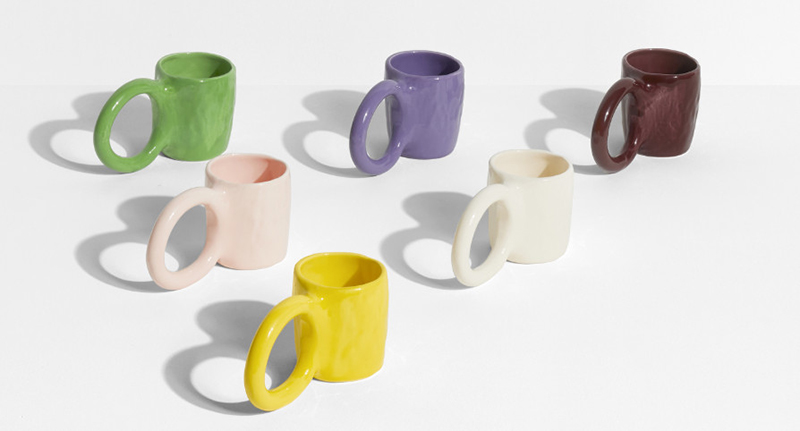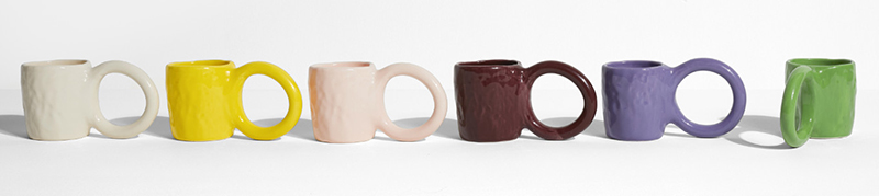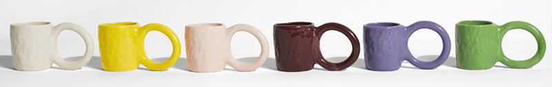 Inspirée par l’univers de la pâtisserie, la designer Pia Chevalier imagine ses mugs comme des gourmandises. L’anse disproportionnée fait référence au donut et l’émail évoque le glaçage. Et pour rester dans cet univers gourmand, chaque couleur évoque un parfum régressif : Citron, Vanille, Cherry, Myrtille, Pistache et Bubble Gum.