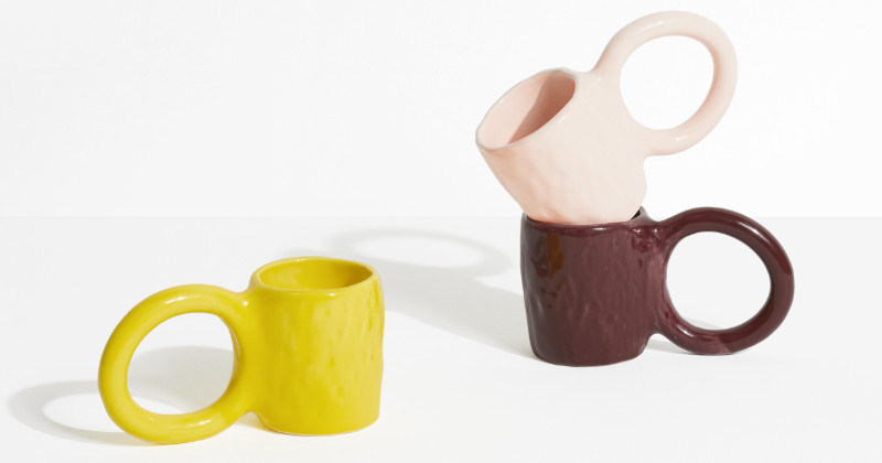 La forme démesurée de l’anse surprend et amuse. L’objet usuel devient sculptural ; accessoire décoratif et signature esthétique de cette collection en céramique. Les aspérités de la matière et les craquelures de l’email varient au gré de la production faisant de chaque tasse un objet unique.