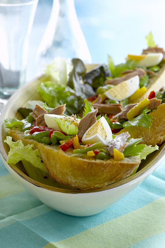 ⑤• Tartiner de mayonnaise, puis déposer quelques feuilles de salade, les légumes, les œufs et le thon émietté.