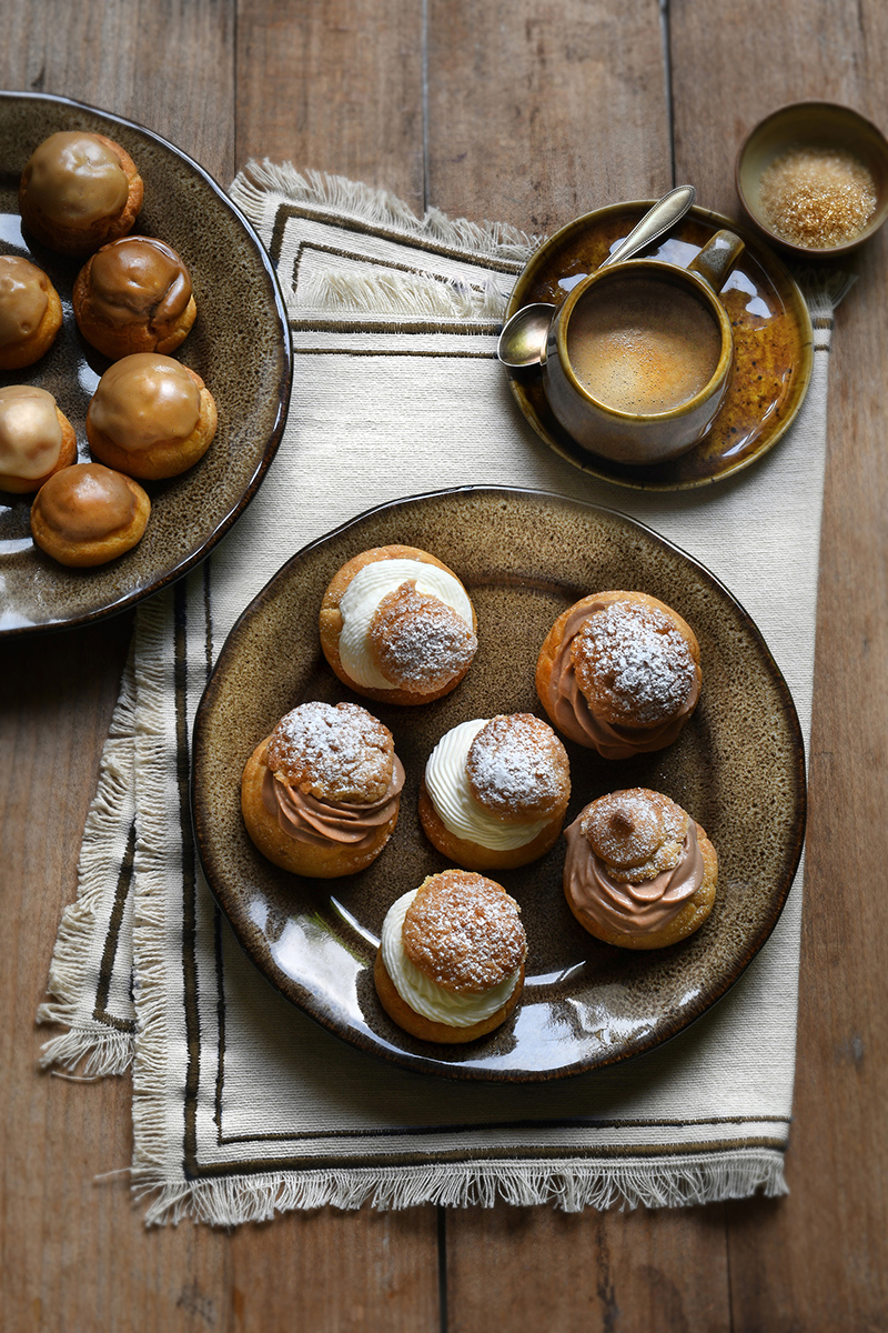 Petits choux à la chantilly vanillée-praliné et Choux à la crème pâtissière et glaçage royal