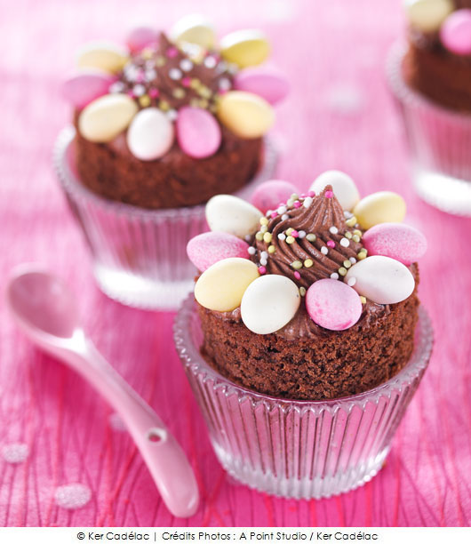 7• Déposer de la mousse au chocolat à l’aide d’une poche à douille dans chaque nid de Moelleux Tout Chocolat, décorer avec des œufs de Pâques.