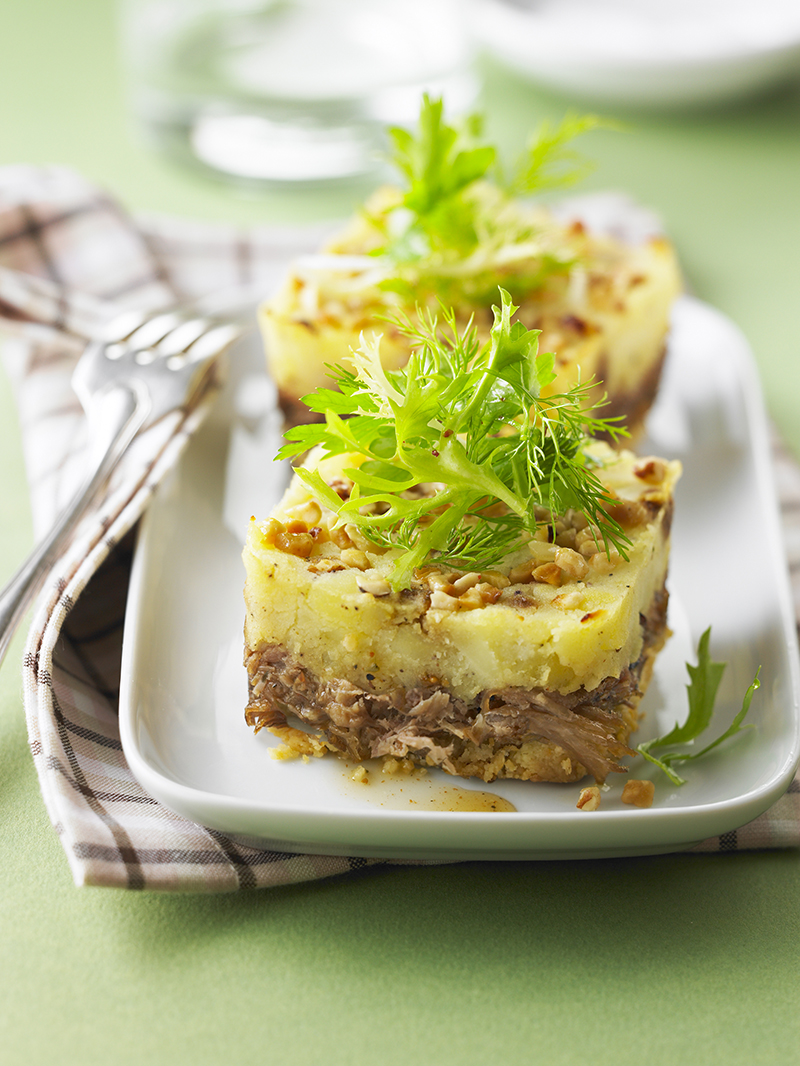 ⑤• Préchauffez le four à 180°C (Th.6). Huilez légèrement 4 emporte-pièces. Déposez-les dans un plat. Déposez une couche de canard dans le fond de chaque emporte- pièce. Recouvrez de purée de pommes de terre et parsemez de noisettes concassées.