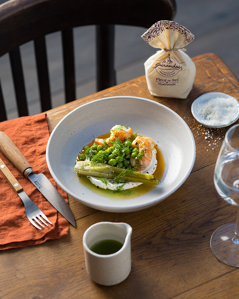Petits pois fumés et langoustines du Croisic grillées à la Fleur de Sel Le Guérandais