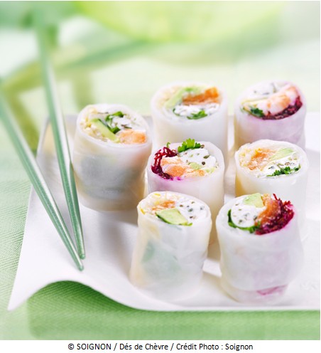 5• Rajoutez quelques Dés de Chèvre et un brin de menthe ou de coriandre fraîche. Rabattez ensuite un côté de la feuille de riz sur votre préparation, puis le deuxième côté (droite/gauche). Rabattez ensuite la partie basse et enroulez en serrant assez fort l’ensemble jusqu’en haut. Renouvelez l’opération avec le reste des ingrédients.